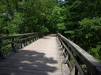 The MKT Nature and Fitness Trail is a recreational rail trail in Columbia, Missouri, that runs nine miles (14 km) in the right-of-way of the former Missouri–Kansas–Texas Railroad. Developed from 1982 onward, it is a spur of the longest rail trail in the United States, the Katy Trail. It is open for use by hikers, joggers, and cyclists year-round, from sunrise to sunset, with snow covering in the winter offering users cross-country skiing opportunities. The trail is made up of "limestone pug" (crushed limestone), creating a hard, flat surface. The trail follows Flat Branch Creek and Hinkson Creek for much of their distance and is part of a larger system of recreational pathways in the Columbia Metropolitan Area.
