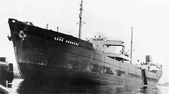Around 10 January 1941, Esso Hamburg left Cherbourg for the North Atlantic, taking a position south of Cape Farewell in Greenland.[3] Esso Hamburg was part of Operation Berlin, which sailed on 22 January 1941, along with the naval oilers Uckermark and Ermland plus the tankers Schlettstadt, Adria and Friedrich Breme.[4] Esso Hamburg sailed north for approximately four weeks before encountering two cruisers. Following standard procedure, the ship tried to flee before the cruisers overtook Esso Hamburg and identified themselves as the Scharnhorst and Gneisenau.[3] On 14 February 1941, as part of Operation Berlin, Esso Hamburg shipped about 2,582 m3 (568,000 imp gal) of oil to the capital ship Scharnhorst.[3][5] According to later prisoner statements, the ship remained in the area north of the Grand Banks of Newfoundland for over two months, where the cold was considered intense (as the crew lacked warm clothing).[3] These prisoners stated that American patrol vessels capable of 20 knots were sighted and Esso Hamburg was fired on, leading Captain Braunwarth to think his ship was being followed.[3] According to Captain Braunwarth (whose interrogation statements have been proven to be false or unreliable), he decided to return to port in St. Nazaire after the rudder was damaged in a storm.[3] On 12 April, the ship returned to port, completing its first Atlantic voyage.[3]