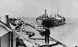 In March 1940, Captain Braunwarth took command of the vessel.[3] In June 1940, she sailed with a cargo of fuel via the Kiel Canal to Bergen. After transferring oil to a submarine close to the Bergen shore, she ripped her hull on a reef.[3] After trying to find a berth, she spent two months being repaired at Akers' yard in Oslo.[3] In November 1940 she sailed back to Kiel, then to Rotterdam to get armaments fitted. These consisted of three French 75 mm guns and three German 20 mm guns. The Esso Hamburg was also fitted with a direction finding (DF) device.[3] In late December 1940, she sailed for Cherbourg where her gun platforms were strengthened and additional fresh water tanks were added.[3]