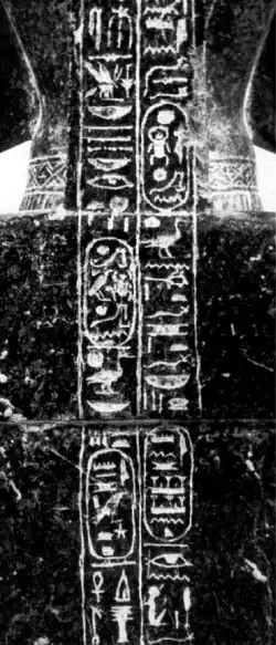 The sole published attestation of Maatkheperre-setepenre Shoshenq-meryamun to date has been an inscription on the dorsal pillar of a seated statue originally representing Thutmose III, now item CG 42192 in the Egyptian Museum in Cairo. This text was inscribed or reinscribed on the orders of King Maatkheperre Shoshenq to commemorate ("renew the name") of his progenitor ("he who begot him"), King Tytkheperre Psusennes II of the 21st Dynasty.[6] Apart from placing Maatkheperre Shoshenq at some point in time after Psusennes II and indicating that this Shoshenq considered himself in some sense the progeny of this Psusennes, the text provides no historical information. Egyptologists have been divided between either explaining away the seemingly unique reference to a king Maatkheperre Shoshenq as an erroneous writing of another king’s names or finding a place for the person and reign of a king bearing these names as a distinct monarch.