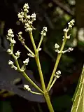 This plant has a mutualistic relationship with predatory ants of the Crematogaster genus. The tree has hollow twigs in which the ants make their nest and provides the ants with food bodies located on the leaf stipules; the ants feed on these and defend the tree against herbivorous insects.[5] Many fewer food bodies are produced by trees that have no ants inhabiting them than are produced by those where ants are present.[5]