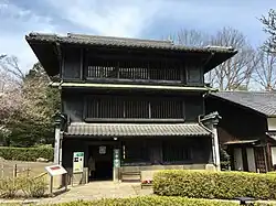 The façade of the second story of a machiya is generally not made of wood, but of earthwork, with a distinctive style of window known as mushiko mado (虫籠窓, lit. 'insect cage window').[9]
