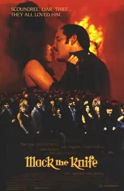 Mack the Knife is a 1989 romantic comedy musical film written and directed by Menahem Golan, a film adaptation of the 1928 Brecht/Weill musical The Threepenny Opera.[1][2][3][4] The film stars Raúl Juliá as Captain Macheath (reprising his Tony-nominated role from Richard Foreman 1974 revival of Opera), Richard Harris as Mr. Peachum, Julia Migenes as Jenny Diver, Julie Walters as Mrs. Peachum, and Roger Daltrey as the Street Singer. Brecht and Weill's score and libretto was adapted by Golan, Marc Blitzstein, and Dov Seltzer.