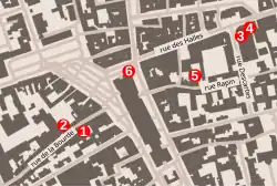 Added to this proven topography are a few rare imaginary or recomposed sites, such as the Pigeonneau-Exelcis bookstore: there did exist on street des Halles, near the temporary chapel, a religious bookstore which served as a model in the first part of the novel.[N 4] On the other hand, the location of the store after its move to street Royale does not correspond to any comparable bookstore; Boylesve, however, used authentic stores on this street to describe it.[3]