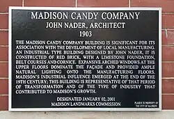 The site was designated a landmark by the Madison Landmarks Commission in 2001, and is also listed on the Wisconsin State Register of Historic Places.[5] The NRHP nomination considers the Candy Company building one of the few intact representatives of the development of industry in Madison in the 1900s. It is also Madison's best example of a historic confectionary facility, and its location in the east-side industrial district is a reminder of the anti-industry attitudes that some in Madison once held. The building is also a good example of industrial design and the work of local designer John Nader.[3]