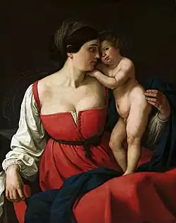 The earliest representation of the Madonna and Child may be the wall painting in the Catacomb of Priscilla, Rome, in which the seated Madonna suckles the Child, who turns his head to gaze at the spectator.[15]