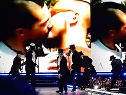 Erin Harde is cited in Catching a Wave (2016) as saying that Madonna has supported the gay community by using "camp" values to pay respect to the community.[39] In this aspect, Muri Assunção from Billboard explained that she has been "fighting for acceptance and pushing the gay agenda with her art" since the release of her first single "Everybody" in 1982.[40] Madonna featured same-sex couples or herself as part of them in some of her videos and concerts.[41][39] Michael Musto said she turned many of her concerts into a "gigantic gay bar".[6]