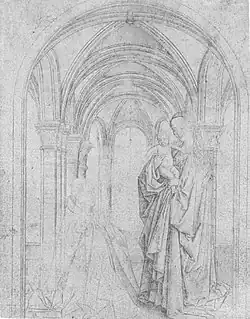 The Madonna of Nicolas van Maelbeke was a large but now lost hinged triptych attributed to Jan van Eyck, thought to have been completed late in his career, perhaps his final work. It is known today through a replica dating to 1757–1760, and several near contemporary silverpoint copies, one by Petrus Christus or his workshop c. 1445 in Vienna, and another by an unknown artist, probably a member of his workshop, which is now in the Germanisches Nationalmuseum in Nuremberg. The original was commissioned by Nicolas Maelbeke for the Saint Martin monastery in Ypres where it was installed in 1445.[1] That the donor is present in the central panel is unusual; typically in mid-15th century triptychs donors would be in an accompanying wing.