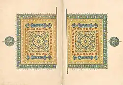 A doorway off the larger mausoleum leads to an irregularly shaped room sandwiched between other chambers in the floor plan. The room has a richly decorated ceiling (similar to the painted and gilded wooden ceilings of the courtyard iwans). It is thought that this room may have been used as a workshop to create Qur'an manuscripts, and/or as place to store them.[1][3]