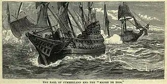 On 3 August 1592,[6] (sources vary as to the date) a six-member English naval squadron fitted out by the Earl of Cumberland and Walter Raleigh set out to the Azores to intercept Spanish shipping from the New World when a Portuguese fleet came their way near Corvo Island.[β] The Roebuck under John Burgh finally took her after a fierce day-long battle near Flores Island.