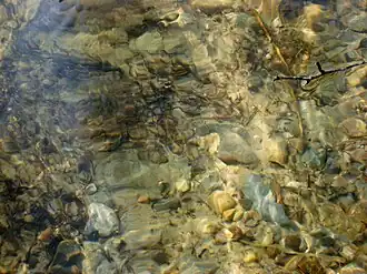 Water in Madum Lake in 2011. The lake's extremely pure and clear water supports a number of rare aquatic plants, including certain species of Lobelia. | |