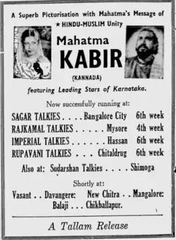 Mahatma Kabir () is a 1947 Indian ⓘKannada-language film directed by R. Nagendra Rao.[1] He also stars in the lead role alongside Subbaiah Naidu. The film deals with Mahatma Gandhi's vision of harmony between the Hindus and Muslims. It was set in the backdrop of the religious violence in India that took place after the Independence from the British rule.[2]