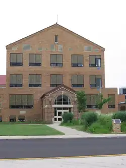The rear entrance of the original building. The brick pedestal at lower right is topped by a sundial, dedicated to the school's science department.