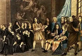 The students at Saint-Cyr first learned theatre in plays written by Madame de Brinon, then in the Conversations written for them by Madame de Maintenon on different moral subjects.[2] They then played in tragedies by Corneille and Racine. However, Madame de Maintenon was unhappy to see the Demoiselles playing scenes of amorous passion with too much ardour, and so Racine wrote the students a religious piece, Esther, which Madame de Maintenon planned to put on before the King and court. This gave rise to a deep dispute between Madame de Maintenon and Madame de Brinon, with the latter opposed to a production that she suspected was only for Madame de Maintenon's own glory. This dispute was not new - since 1687, Madame de Brinon frequently reproached Madame de Maintenon for being around the establishment too much and imposing on Madame de Brinon, its superior.[3] Being its superior for life, Madame de Brinon could not be replaced, but a lettre de cachet sealed on 10 December 1688 allowed the play to be put on. Madame de Loubert, previously secretary to Madame de Maintenon and aged only 22, replaced Madame de Brinon as secretary on 19 May 1689.[6]