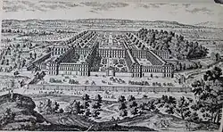The domaine of Saint-Cyr was assigned to the Maison in 1685, and the King ordered[2] major building work on the domain next to Versailles, led by Jules Hardouin-Mansart.[5] The project cost the King 1,400,000 livres.[5] Hardouin-Mansart's designs for the Maison used the U-shaped plan he often used elsewhere, with the buildings reserved for the mistresses and students forming an H, to which the school chapel had to be added to the west. The classrooms and students' dormitories were on the first and second floors respectively, the dormitories just above the classrooms for the corresponding classes. Each dormitory held 40 beds and was surrounded by two cells for the mistresses. Each classroom was also juxtaposed with a small supplementary dormitory with 20 beds, itself next to two cells for the mistresses. The infirmary was sited away from the dormitories to allow the sick to be isolated and thus avoid the spread of contagious diseases.[2] The rooms reserved for pensionnaires were situated to the east of the buildings, to put them as far as possible from the visitor entrance, situated to the west at the level of the external courtyard.