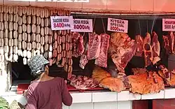 Since at least 1915, rice (vary) has been the cornerstone of the Malagasy diet and is typically consumed at every meal.[47] James Sibree noted that the verb "to eat a meal" in the Malagasy language is commonly mihinam-bary —literally, to eat rice.[47] Rice may be prepared with varying amounts of water to produce a fluffy dry rice (vary maina, [ˌvarʲ ˈmajnə̥]) eaten with some kind of accompaniment (laoka) in sauce. It may also be prepared with extra water to produce a soupy rice porridge called vary sosoa ([ˌvarʲ suˈsu]) which is typically eaten for breakfast or prepared for the sick.[48] Vary sosoa may be accompanied with a dry laoka such as kitoza, smoked strips of zebu meat.[49] A popular variation, vary amin'anana ([ˈvarʲ ˌjamʲˈnananə̥]), is a traditional porridge made with rice, meat and chopped greens.[50]