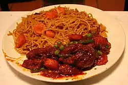 Sri Lankan Malay cuisine has played a significant role in shaping Sri Lankan cuisine. Achcharu is a dish that originates from the local Malay community and is now widely popular among all ethnic groups in the country.[21][22] It is a selection of vegetables in a pickled sauce and blends sweet, sour and spicy flavours.[23] Mee goreng and nasi goreng are also popular, a result of cultural influences from Indonesia and the country's Malay community.[24][25][26]