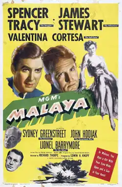 Malaya is a 1949 American war thriller film set in colonial Malaya during World War II directed by Richard Thorpe and starring Spencer Tracy, James Stewart and Valentina Cortese. The supporting cast features Sydney Greenstreet, John Hodiak, and Lionel Barrymore, with Richard Loo and Gilbert Roland. It was produced by Metro-Goldwyn-Mayer.