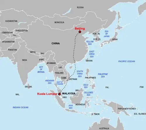 Flight 370 was a scheduled flight in the early morning of Saturday, 8 March 2014, from Kuala Lumpur, Malaysia, to Beijing, China. It was one of two daily flights operated by Malaysia Airlines from its hub at Kuala Lumpur International Airport to Beijing Capital International Airport—scheduled to depart at 00:35 local time (MYT; UTC+08:00) and arrive at 06:30 local time (CST; UTC+08:00).[59][60] On board were two pilots, 10 cabin crew, 227 passengers, and 14,296 kg (31,517 lb) of cargo.[26]: 1, 12, 30