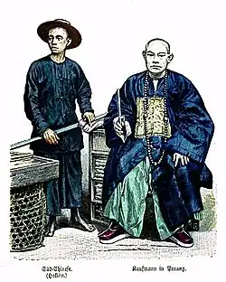 Since their early ancient trade connection and subsequent migrations, the majority of ethnic Chinese in Malaysia are ethnic Han from the historical areas of Fujian and Guangdong provinces in southern China.[144] Nearly all ethnic Chinese Malaysians living in the country today are either patrilineal descendants of these early immigrants, or new immigrants born in mainland China.[145] Among the first group from the first migration wave are the Peranakans in Kelantan and Terengganu, Sino-Natives in Sabah and Straits-born Chinese (Baba-Nyonya) in Malacca and Penang.[137][138][146] The Taiping Rebellion in the mid-19th century caused much chaos and suffering in southern China, which led many ethnic Chinese civilians to seek refuge overseas, particularly to the Nanyang region (Southeast Asia) in further south.[147] With the expanding British colonial ambitions in the region which led to the establishment of Straits Settlements, more migrants were attracted and the region became an important destination for Chinese emigration.[147]