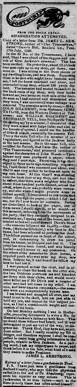 In July 1828, in the thick of the 1828 U.S. presidential election between Andrew Jackson and John Quincy Adams, Malcolm Gilchrist "of Alabama," William Gilchrist and Archibald Yell from Shelbyville, and Jesse Taylor from "the Western District of Tennessee," were involved in the beating of a Bedford County man named Dr. James Armstrong.[8] Armstrong was the author of a pamphlet itemizing Andrew Jackson's predilection for violence.[9] According to the editor of the Kentucky Reporter of Lexington, the beating was because they had identified Armstrong as the Tennesseean who had been writing anti-Jackson columns.[9] According to a 20th-century profile of Yell, who was elected to be the second Governor of Arkansas in the 1840s, Nashville, Tennessee newspapers claimed the beating was because Armstrong had insulted Gilchrist's father by describing him as a Tory (Revolutionary-era British sympathizer).[8] Both accounts agreed that the men wanted Gilchrist to sign a paper disclaiming his previous statements, whatever they may have been, and that Malcolm Gilchrist had repeatedly clubbed Armstrong.[8][9] The Nashville paper claimed the beating was with a hickory stick.[8] The Lexington paper reported that Gilchrist and the others had also been brandishing pistols, and in the fracas Malcolm Gilchrist dropped his pistol and when recovered by Armstrong's neighbors it was found to have been "heavily loaded".[9] Armstrong also claimed that the force of the blows to the head "cut to the skull."[9] Accounts of the incident appeared in newspapers nationwide.[8]