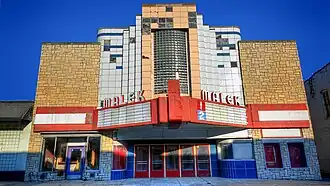 The Malek Theatre, also known as The Malek, is an Art Deco theatre in downtown Independence, Iowa that was built in 1947. It replaced the Grand Theatre, which had burned on March 3, 1945.: 15 It was designed by Wetherell & Harrison for Bob C. Malek and was intended to be fireproof. It has a steel truss roof. A stepped tower at the front is made with structural glass and glass blocks. As of 2009 the interior was mostly original, with Art Deco style light fixtures and coved ceilings. Artist Merle Reed, of California, hand-painted its interior designs in 1945.[2]