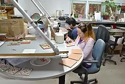 Just as early photographs show workers at Malibu Potteries,[10] usually women, applying glazes to bisque tile having resist patterns, modern ceramicists rely upon virtually the same technique. Tile with resist lines circulate on a Lazy Susan while 'glazers' use bulb syringes to squeeze the wet glaze onto the tile. Since unfired glaze does not necessarily look the same color as a fired glaze, a schematic is usually close by to identify where the appropriate glaze goes on the tile. Glazers with steady hands and a good attention span produce tiles with consistent edges and infrequent run-over.