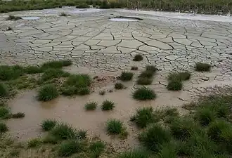 The Malvizza mud volcanoes (from malvizza, the name of a bird in the Irpinia dialect[2]) are located in the Campania Apennines, in the municipal territory of Montecalvo Irpino, along a plateau of the Miscano valley at an altitude of 518 m (1,699 ft) above sea level. They are characterized by the emission of gaseous hydrocarbons—primarily methane, which at most sites accounts for more than 90% of emissions[1]—as well as a continuous flow of weakly alkaline water (pH = 8) at a temperature of 18 °C (64 °F).[3] The solid component of the mud is composed of more than 95% illitic clay, with only traces of calcite and quartz. The deep layers of the subsoil of the Malvizza mud volcanoes are primarily scaly clays,[4] alternating with regular layers of brecciole and nummulitic limestone.[5]