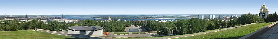 Mamayev Kurgan (Russian: Мама́ев курга́н) is a dominant height overlooking the city of Volgograd (formerly Stalingrad) in Southern Russia. The name in Russian means "tumulus of Mamai".[1] The formation is dominated by a memorial complex commemorating the Battle of Stalingrad (July 1942 to February 1943). The battle, a hard-fought Soviet victory over Axis forces on the Eastern Front of World War II, turned into one of the bloodiest battles in human history.[2] At the time of its installation in 1967 the statue, named The Motherland Calls, formed the largest free-standing sculpture in the world.[3]