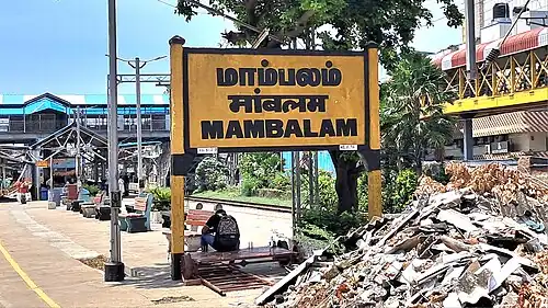Mambalam Railway Station (station code: MBM[3]) is an NSG–3 category Indian railway station in Chennai railway division of Southern Railway zone.[3] It is one of the railway stations in Chennai, India, on the Chennai Beach–Chengelpet section of the Chennai Suburban Railway Network. It is situated in the neighbourhoods of West Mambalam and T. Nagar, about 11 km (6.8 mi) from Chennai Beach, and has an elevation of 13 m (43 ft) above sea level.