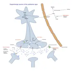 Levodopa (or L-DOPA) has been the most widely used treatment for over 30 years.[3] L-DOPA is transformed into dopamine in the dopaminergic neurons by dopa-decarboxylase.[3] Since motor symptoms are produced by a lack of dopamine in the substantia nigra, the administration of L-DOPA temporarily diminishes the motor symptoms.[3]