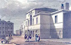 A crowd estimated at 8,000–10,000[39] gathered outside the walls of Salford Gaol on the evening of 22 November 1867 to witness the public execution of the three convicted men the following morning. A platform had been built about 30 feet (9.1 m) above ground, through the outside wall of the jail facing New Bailey Street, to support the gallows. The spectators were "well supplied by the gin palaces of Deansgate and the portable beer and coffee stalls".[40] According to Father Gadd, one of the three Catholic priests who attended to the men: