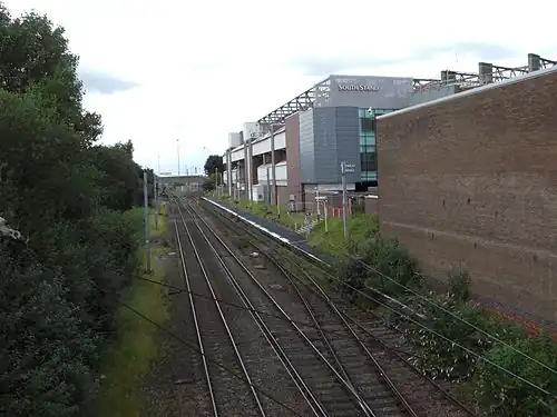 Manchester United Football Ground railway station, often known as the Old Trafford Halt or Manchester United FC Halt,[2] is sited adjacent to Old Trafford football stadium in the area of Old Trafford, Greater Manchester, England. It is on the southern Liverpool-Manchester line between Deansgate and Trafford Park. Services to the station are currently suspended.
