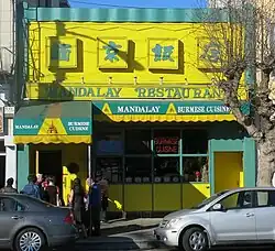 Located on 4348 California Street, the Burmese restaurant Mandalay serves tea leaf salad composed of lentil seeds, shrimp, garlic, and peanuts with imported tea leaves,[1] as well as paratha, mohinga, and noodle and samusa soups.[2][3][4][5]