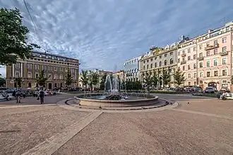 The shape of Manezhnaya Square is close to the right-angled triangle. Its longest cathetus, the southern side of Manezhnaya Square is formed with Italyanskaya Street, which runs parallel to Nevsky Prospect, at about hundred meters north of it. The shortest cathetus is Karavannaya Street, which forms the eastern side of the square running from Nevky prospect to the north. Another street connecting the square to Nevsky is Malaya Sadovaya which intersects Italyanskaya Street at the western corner of the square. Here converges the third, longest side — the "hypotenuse" of this triangle square. Driveways flanking one of the buildings on this side of the square merge behind it into a boulevard, Klenovaya alley, which runs from Manezhnaya Square to Mikhailovsky Castle.[3]