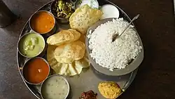 Since Mangalore is a coastal city, fish forms the staple diet of most people.[1] Mangalorean Catholics' Sanna-Dukra Maas (Sanna – idli fluffed with toddy or yeast; Dukra Maas – Pork), Pork Bafat, Sorpotel and the Mutton Biryani of the Muslims are well-known dishes. Snacks such as happala, sandige and puli munchi are unique to Mangalore. Khali (toddy), a country liquor prepared from coconut flower sap, is popular.[2][3][4][5]