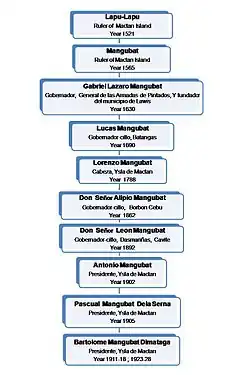 - Bartolome Dimataga y Mangubat (1910–1916; 1919–1928) Mactan Island Municipal President. His direct descendants include, Mayor Mariano Dimataga (Lapu-lapu City); Cabinet Secretary Jose Rene Almendras, former Philippines first lady Leonila Dimataga Garcia; former Vice Mayor (Danao, Cebu) Rosita Dimataga Almendras.