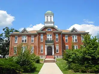 Built in 1895, this historic structure is a two-and-one-half-story brick building that sits on a stone foundation. It has a cross-axial plan with a two-story main section, flanked by two-story wings in the east and west sides. The front facade features a three-story tower with frame bell tower.[2]