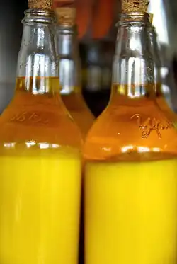 Manteiga de garrafa is a dairy product made from the cream of cows' milk.[1] The cream is processed by physical agitation, as in a blender or beating by hand, followed by cooking at a temperature of 100 °C (212 °F) to 130 °C (266 °F). Salt may also be added.[1] Some recipes for making manteiga de garrafa include a step prior to cooking in which the congealed cream is washed in cold water.[2] The cooking process separates the cream into two components, the manteiga (butter) and the "borra" (a watery precipitate). The manteiga is separated from the borra by filtration, and then placed in bottles. The finished product is almost pure fat, with a low water activity. Accordingly, it is inhospitable to microbial growth and can be kept at room temperature.[1][3]