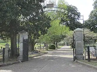 Maple Hill Cemetery (also known as Evergreen Cemetery) is located on Holly Street, north of the center of Helena, Arkansas, United States. It is set on 37 acres (15 ha) of land on the east side of Crowley's Ridge, overlooking the Mississippi River, and is the city's largest cemetery. The cemetery was established in 1865, and is laid out in the rural cemetery style which was popular in the mid-19th century. It departs from the norms of this style in retaining a largely rectilinear layout despite having parklike features. The cemetery's entrance is through an elaborately decorated wrought iron archway, whose posts were given in 1914, and whose arch was given in 1975. The largest monument in the cemetery is the Coolidge Monument, placed by Henry P. Coolidge on the family plot, which is at the highest point of section 3; the monument is a granite column 21 feet (6.4 m) in height, with a life-size sculpture of Coolidge on top.[2]