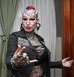Her body modifications also include a split tongue, subdermal implants, piercings, ear expansions, eye tattoos, scarification, and dental implants.[7][10][11]