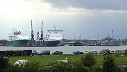 The port again found use during the Falklands War, when it was employed to transport men and equipment to the Falkland Islands.[3] The port aided Operation Corporate as a launching point for the Royal Fleet Auxiliaries Round Table class landing ships, armoured vehicles were also transported from Marchwood to the Europic Ferry via Mexeflote and then on to the Falklands. The port also became a massive assembly area for cargo and armoured vehicles which were subsequently forwarded to Southampton for transportation to the Falklands as required.[2] At the conclusion of the war the port was used to receive 80 war dead, who were kept in the cargo shed, before being processed and returned to their families for funerals.[2]