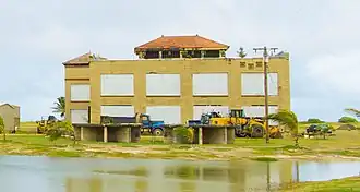 Opened in 1914, at a cost of more than one million dollars,[4] the first message was sent from Iolani Palace to Kaimuki. By 1916 messages were being sent to Japan, at a distance of 4,200 miles.[5] A hotel was built to accommodate employees, along with a station master's building and an additional administration building. A library was provided for staff, and the hotel had a full-time Chinese cook.[6][7] In 1917, the United States took over control of all wireless stations. Following the war's conclusion, RCA ended up with ownership of the Kahuku station. The rapid acceleration of radio technology development meant that the station became obsolete much sooner than anticipated. By 1919 the station was already being described as "junk". In 1924 its chimney was removed, as steam was no longer being used to power the station. RCA installed new Alexanderson alternators were installed in 1921, with an output of two hundred kilowatts. In 1931, the original 470 foot tall masts were replaced by 100 foot wooden masts, thanks to advances in short wave technology. During World War Two the site hosted an airfield, but a tsunami destroyed much of the base. Later on, the Turtle Bay Golf Course built over much of one of the runways, and no military structures remain. During the early 2000s, the site was used for aquaculture and the telegraph station was beginning to deteriorate. In 2005 the station and surrounds were purchased by a businessman, and are currently being redeveloped for tourism.[8][9] In 2024 the current owners and developers demolished the roof and interior of one the remaining structures without a permit. [10]