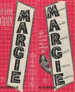 Margie is a 1946 American romantic comedy film directed by Henry King and starring Jeanne Crain, about a high school girl in the 1920s who develops a crush on her French teacher. Margie was a box-office hit, ranking in the top 15 highest-grossing films of the year,[4] and established Crain as an important Fox star.[5] Although not a true movie musical (as it uses period recordings, with only a few songs being partially performed by characters in the film), it is sometimes classified with musicals for the large number of 1920s-era popular songs incorporated as nostalgic background in the film.[6]