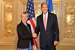 Margot Elisabeth Wallström (Swedish pronunciation: [ˈmǎrːɡɔt ˈvâlːstrœm]; born 28 September 1954)[1] is a Swedish politician of the Swedish Social Democratic Party who served as Deputy Prime Minister of Sweden and Minister for Foreign Affairs from 2014 to 2019 and Minister for Nordic Cooperation from 2016 to 2019.