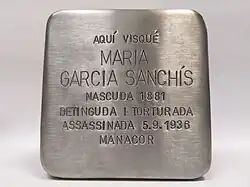 - ^ "El Govern coloca en Sabadell la Piedra de la Memoria que recuerda a Maria Garcia Sanchís, ejecutada en Mallorca en 1936". Europa Press (in Spanish). 27 March 2022. Retrieved 30 May 2023.