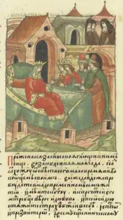Maria's origins are disputed. Some sources say she was Ossetian or Alan and connected to the Georgian royal house, while others, such as the Uspensky Sbornik (a 13th-century text now housed in the Russian State Museum in Moscow), say she was Moravian. M. V. Shchepkina posited the idea that the Sbornik was compiled for Maria in 1199–1206,[1] and thus the claims that she was Moravian might be more believable than the other claims, but Caucasian chronicles claim Vsevolod traveled to Tbilisi in 1170 (from Constantinople), where he was married to Maria at the suggestion of the Georgian King. The date of her death is also uncertain, as 19 March 1205 is also given in some accounts. The Novgorod First Chronicle mentions her death under the year 1205, but does not give an exact day.[2] As it is mentioned after her son Konstantin's arrival in Novgorod on March 20, it would seem she died after that, perhaps in May.