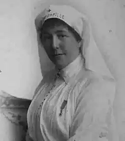 In 1907, de Villegas de Saint-Pierre became one of the founders of the Saint-Camille Nursing School (French: École d’infirmières Saint-Camille), a Catholic training facility, which educated nurses with a religious, rather than secular method.[5] She believed that training was needed, but as a devout Catholic felt that science and religious training could co-exist.[1][3] She undertook nursing classes herself, and upon hearing rumors of impending war, took steps to have the Belgian Red Cross assist with training at the school.[3] When World War I began, she went to the Ministry of War to complete permits to have her castle at Chevetogne turned into a neutral hospital for troops on both sides of the conflict. The facility served as a temporary emergency station, called an "ambulance",[6] and required modifications to be suitable, such as remaking the castle living room into an operating theater.[7] At the end of August 1914, the Germans began occupying the castle and though de Villegas de Saint-Pierre and her nurses continued to work, she made plans to work at the front.[8] Closing the hospital,[7] in November, she traveled through the Dutch port of Eijsden, staying with family until she could book passage on the ferry to Calais.[9] She was also able to briefly see her brother, Louis, who having been injured in battle, was serving as a consul in Maastricht.[7]