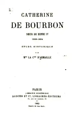 - 1865, Catherine de Bourbon, soeur de Henri IV, 1559-1604, étude historique[6] (text)