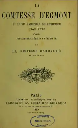 - 1890, La comtesse d'Egmont, fille du maréchal de Richelieu (1740-1773) d'après ses lettres inédites à Gustave III[6] (text)